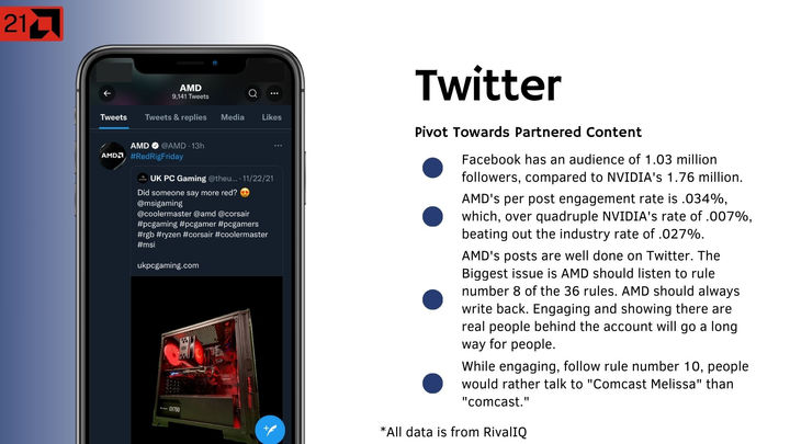 The biggest takeaways from social listening were AMD's strong ties to other large brands that are creating interesting and groundbreaking products, and content that leverages those connection performs much better. Focusing on using business connections that already exist from B2B interaction and using their established relationships to create customer facing marketing content that connects them with their partners audiences.