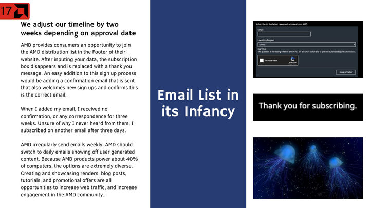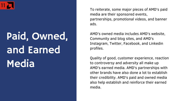 Conducted social listening over the course of three months. Used web analytics tools to gather data on AMD’s brand presence. Used SimilarWeb to identify which websites customers find AMD products through, MOAT for identifying banner ads, RivalIQ for social media tracking, and tracked AMD's email list while conducting social listening.
